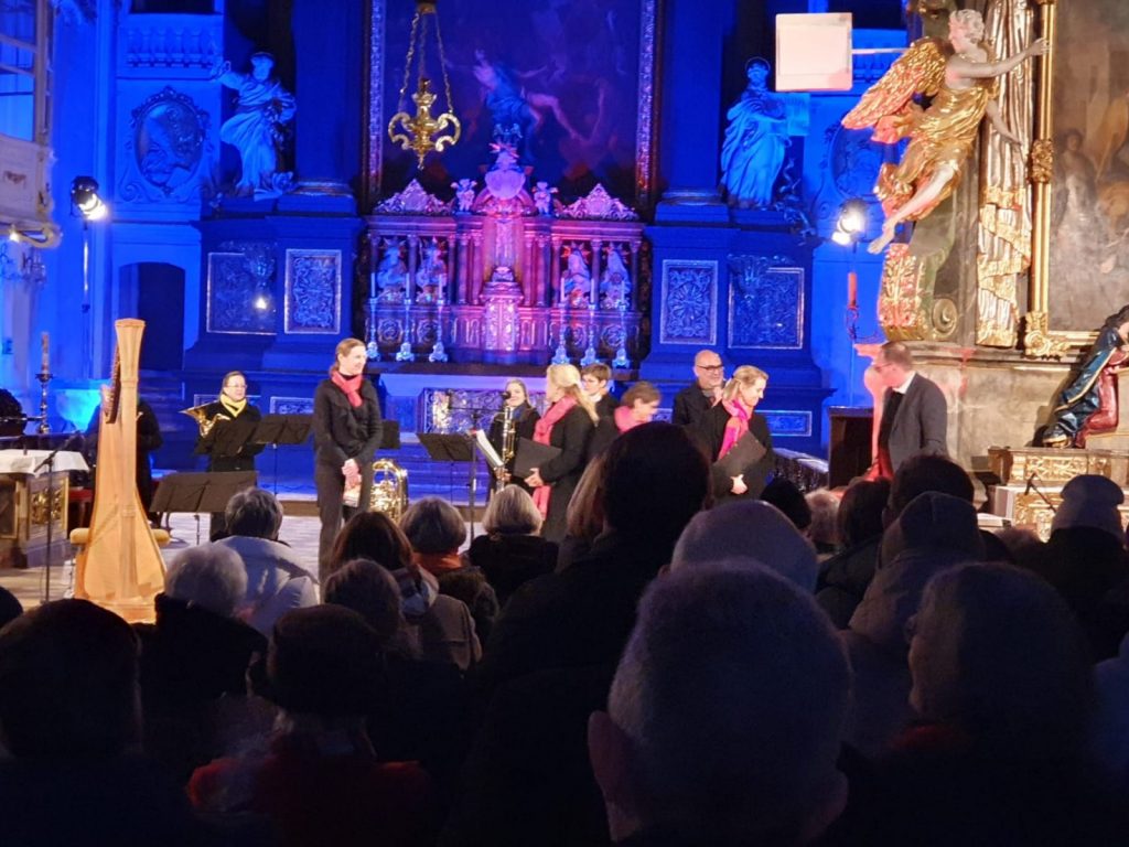 Es erwartete uns eine wundervolle Atmosphäre in der Basilika. Die Beleuchtung und der Schmuck erstrahlten den Kirchenraum sehr feierlich. Das Programm war sehr vielfältig, es traten vier künstlerische Gruppen auf, die abwechselnd vokale und instrumentale Stücke vortrugen.
